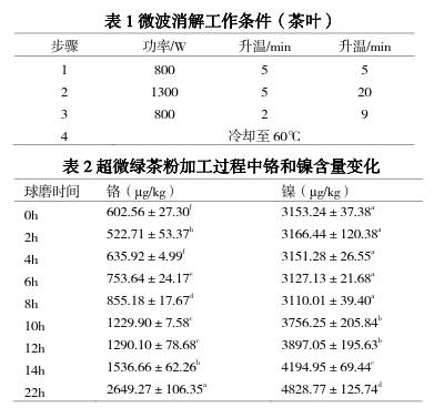 血[6];過量的鎳可引起炎癥、癌癥、癥、系統(tǒng)紊亂、降低生育能力、致畸和致突變等[7];鉻雖是人體必需的微量元素,但高鉻的食用也會(huì)引起不適[8]。超微綠茶粉是將達(dá)到綠色標(biāo)準(zhǔn)的綠茶茶葉,經(jīng)超微粉碎形成 200 目(74μm)甚至達(dá)到 1000 目(12μm)以上的綠茶超微細(xì)粉[9-10]?,F(xiàn)階段我國(guó)企業(yè)大多采用球磨方式加工超微綠茶粉,在球磨加工過程中,茶葉被粉碎的同時(shí),研磨材料本身也會(huì)發(fā)生變化,從而可能給超微綠茶粉帶來重金屬污染。另外,與傳統(tǒng)茶葉不同的是,超微綠茶粉屬于茶葉深加工范疇,常被以全組分形式加入到食品和化妝品中[11],又因其中的重金屬元素應(yīng)滿足《食品標(biāo)準(zhǔn)食品中污染物限量》和《茶葉中鉻、鎘、汞、砷及氟化物限量》對(duì)茶葉中重金屬限量要求[12-13],因此應(yīng)對(duì)超微綠茶粉加工過程中重金屬污染給予關(guān)注,但目前對(duì)超微綠茶粉加工過程中的重金屬含量變化未見報(bào)道。本文對(duì)球磨加工過程中超微綠茶粉的重金屬含量進(jìn)行檢測(cè)分析,同時(shí),采用三組球磨材料不銹鋼球-不銹鋼罐、氧化鋯球-不銹鋼罐、瑪瑙球-尼龍罐對(duì)超微綠茶粉進(jìn)行加工,通過重金屬元素鉻和鎳的檢測(cè),并結(jié)合粒徑分析,為尋找合適的球磨材料提供依據(jù)。