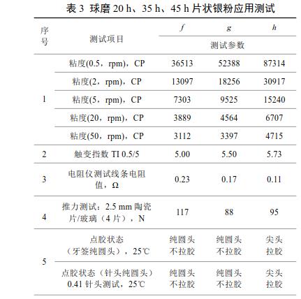 由表3可知,球磨20h、35h片狀銀粉制得IC封裝導(dǎo)電銀膠點(diǎn)膠效果好,無明顯拉膠現(xiàn)象;45h的制得導(dǎo)電銀漿點(diǎn)膠存在尖頭和拉膠現(xiàn)象。同時(shí)可以看出,20h的片狀銀粉觸變指數(shù)低,導(dǎo)電銀膠需要有良好觸變特性便于點(diǎn)膠;45h的片狀銀粉觸變指數(shù)高;而且可以看出35h、45h制得的導(dǎo)電膠的線條電阻值較小。這三款產(chǎn)品推力測(cè)試、固化后硬度測(cè)試、高低溫冷熱沖擊測(cè)試及高溫高濕測(cè)試均滿足應(yīng)用。綜合上述各項(xiàng)指標(biāo),球磨35h制得的片狀銀粉制得的導(dǎo)電銀膠均達(dá)到了應(yīng)用指標(biāo)要求。